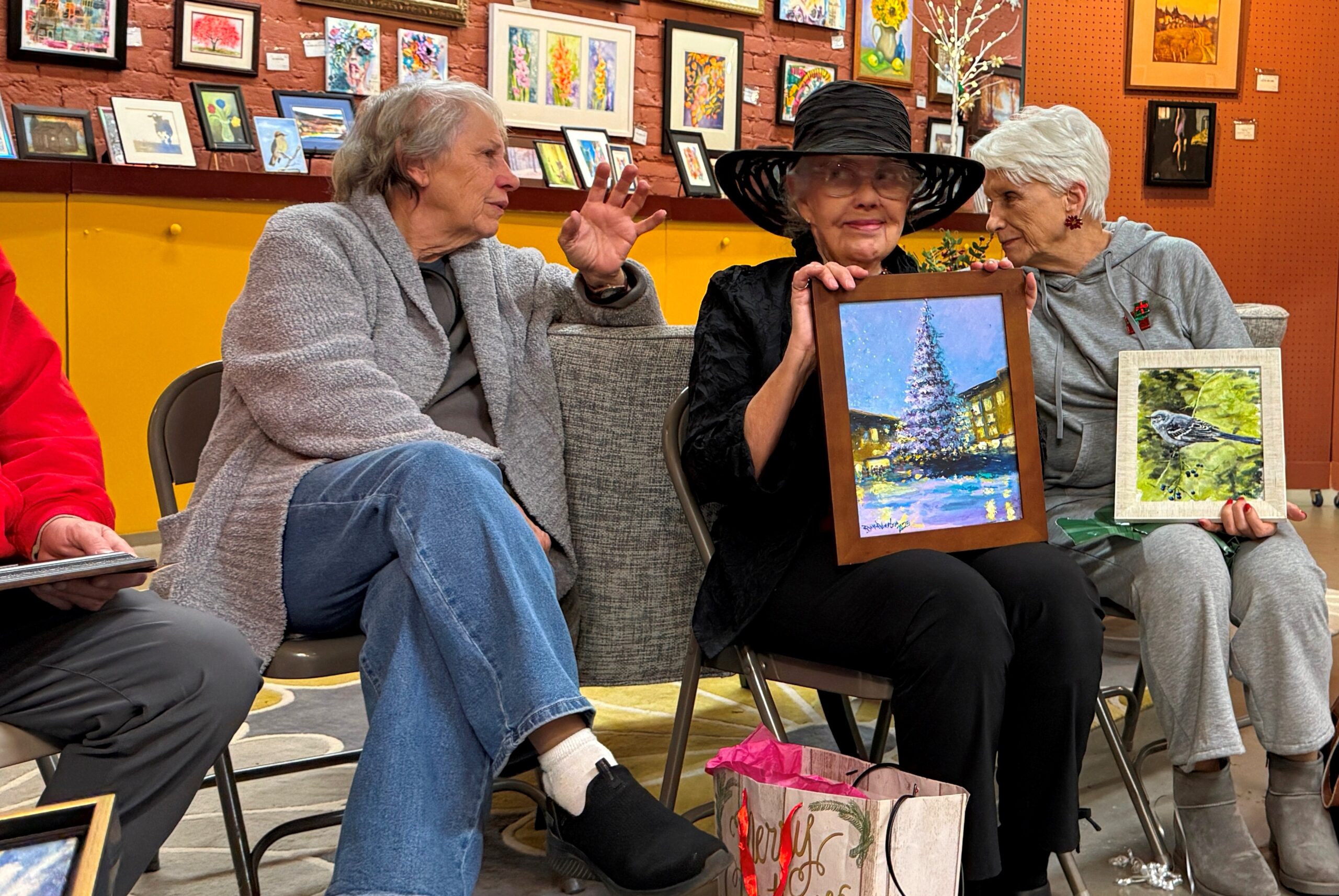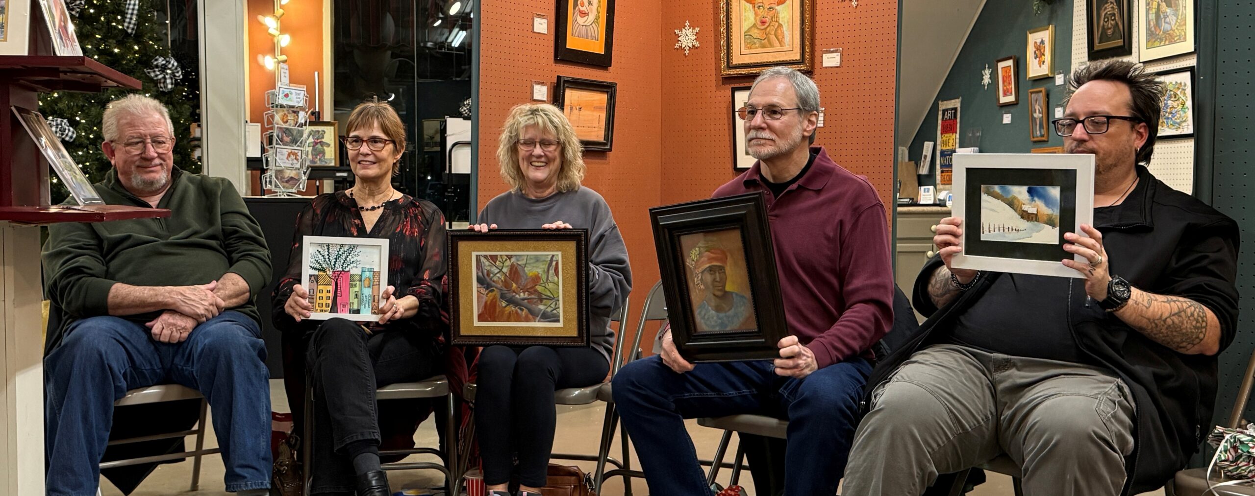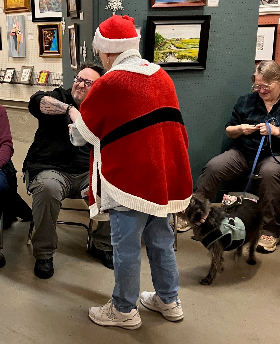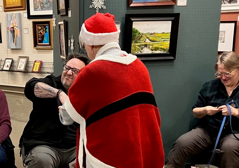 Our December Painting Exchange is always a happy, merry, and festive time. Plus lots of great snacks and artful surprises!