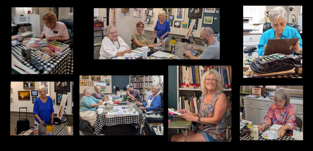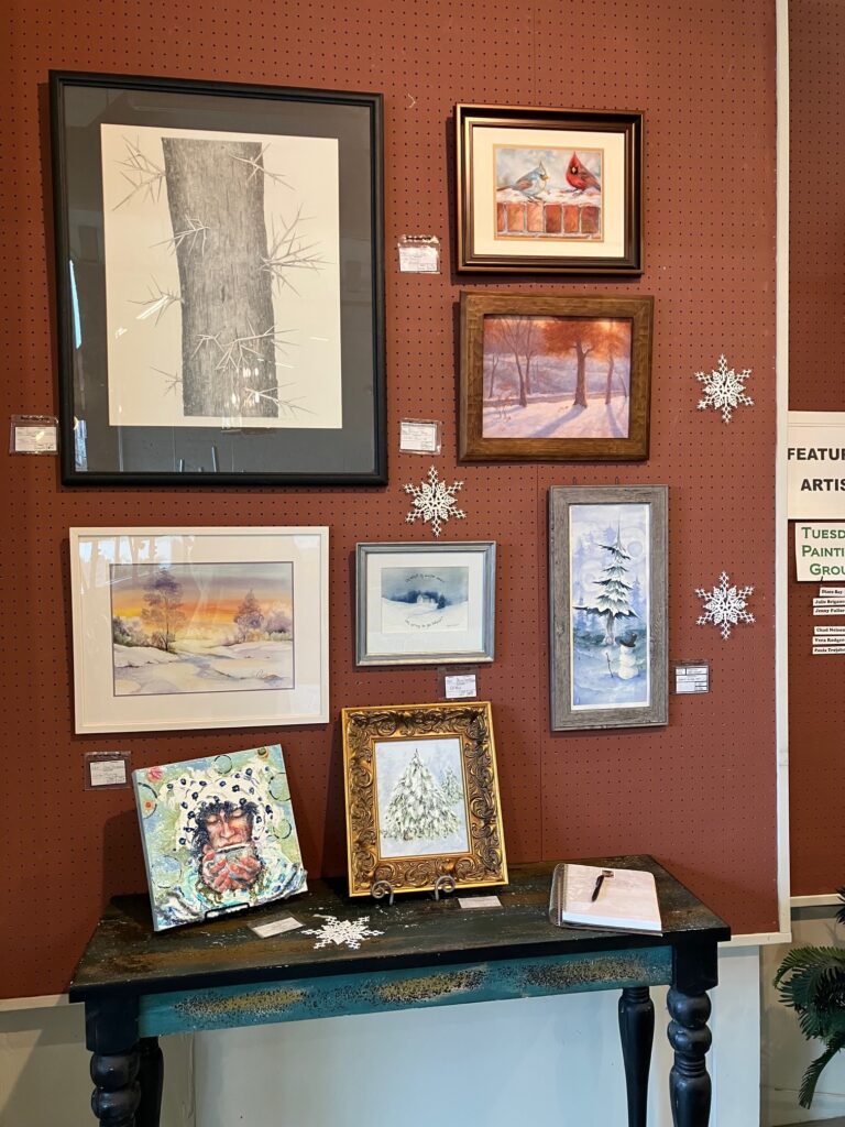 For December and January we are Featuring the members of The Tuesday Group. The Tuesday Group is a collection of friends, artists, that get together every Tuesday at the gallery to paint and talk and eat. We start off setting down our supplies and start talking, about life, or family or events or art. One or two may go ahead and get started painting, and then maybe another, all the while talking. A small bit of work gets done and then it’s lunch time, Kirchhoff’s, or something from home, or maybe Midtown Market. After lunch….we really get serious about art. Usually before the day is over one or two has propped up their art and asked for opinions and advice. It’s what we do. Most of us have worked in 2 or more mediums over the course of our lives and have been creative most of that time. So we’re experienced and know a bit, we’re very kind and gentle with our thoughts. It gives us all a chance to share and learn from each other.