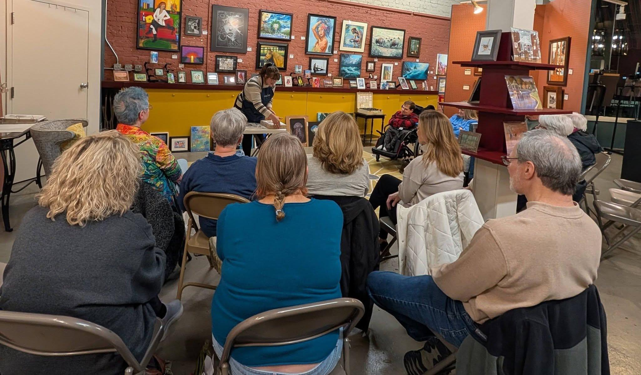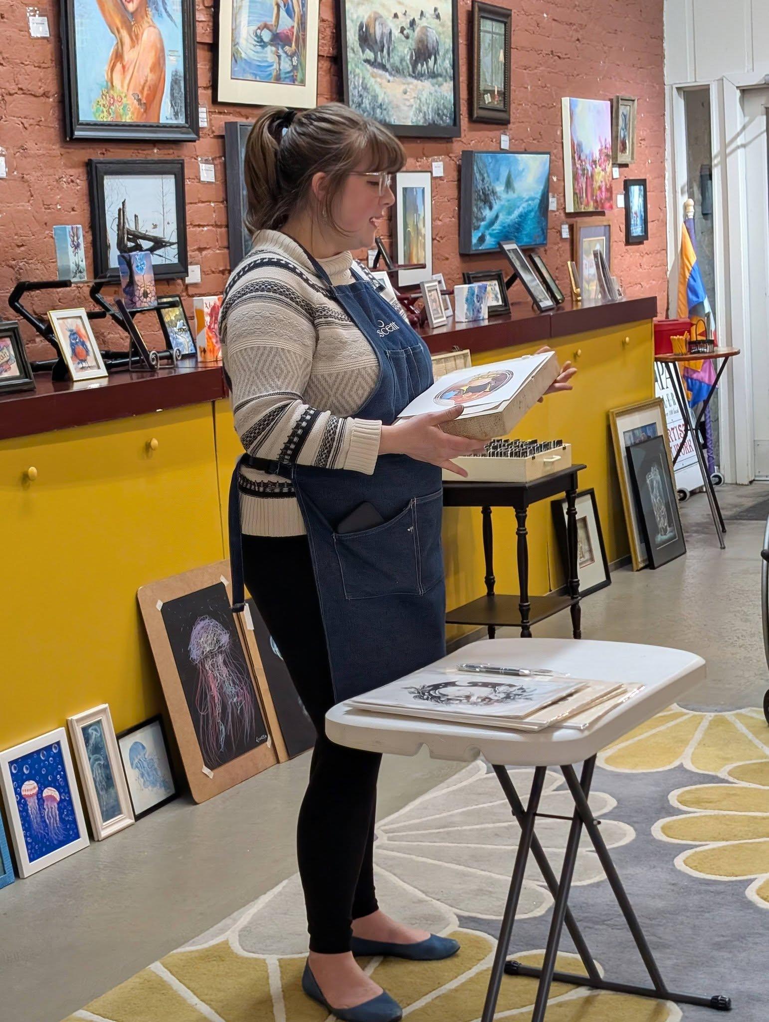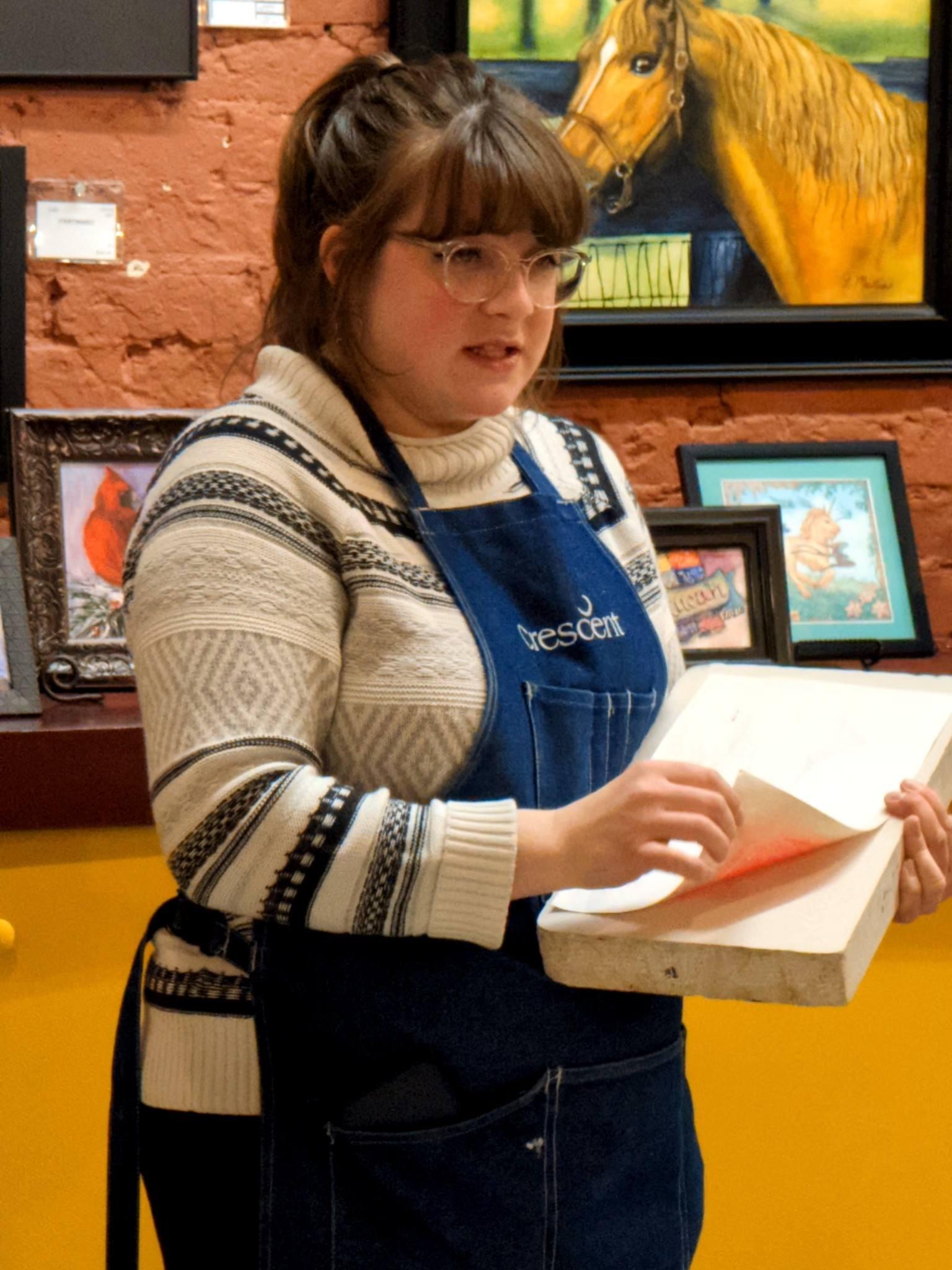 Savannah Vincent, Broadway Custom Framing, shared her knowledge and skills in printmaking at our member meeting. She gave a very informative and interesting presentation on lithographic printing.