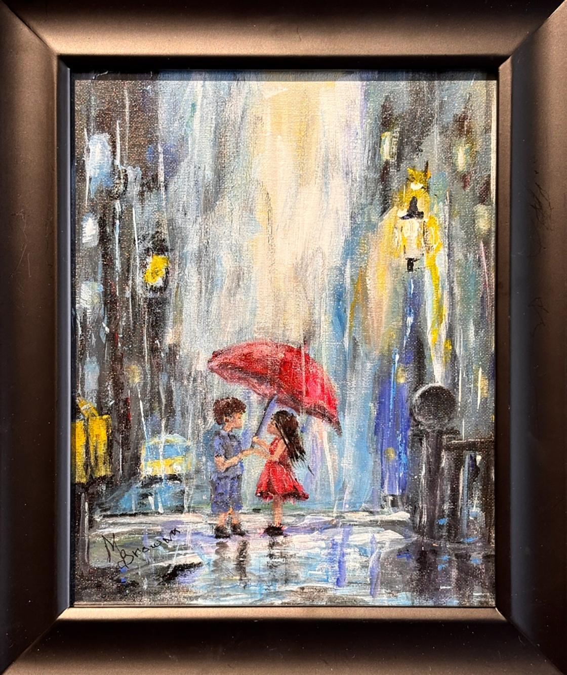 Spring brings so many long awaited pleasures! PAPA artist Martha Brown provides a sentimental reminder in her painting “Puppy Love.” Sharing a red umbrella, this young couple seems to be enjoying a moment. Standing in the middle of a cityscape with pouring rain all around, they appear oblivious to anything but each other. Even if you never had one of these moments, you can view this scene and imagine what they might be feeling. Martha’s use of color brings the pair into focus right away. Her brush strokes help us appreciate the ferocity of the downpour along with all the accompanying sounds. “Puppy Love” is just one delightful painting among many in our spring show. We hope you’ll come by and spend some time enjoying art with us!